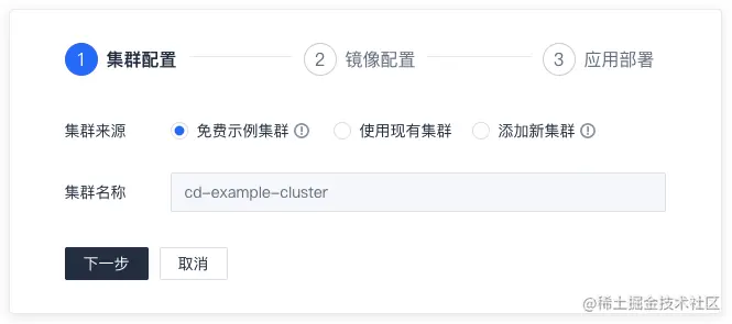您可以勾选使用官方提供的「免费示例集群」快速体验。如您用于正常生产的项目,请选择添加新的集群或已有集群。