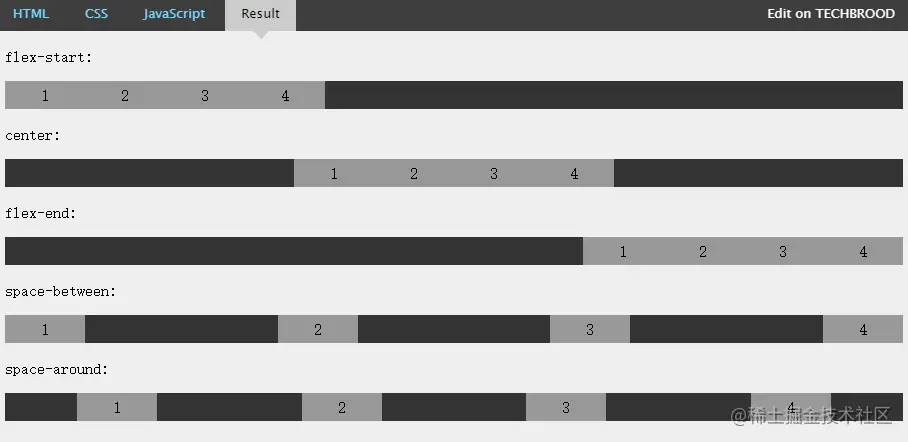 弹性项目向行头紧挨着填充。这个是默认值。第一个弹性项的main-start外边距边线被放置在该行的main-start边线,而后续弹性项依次平齐摆放。
