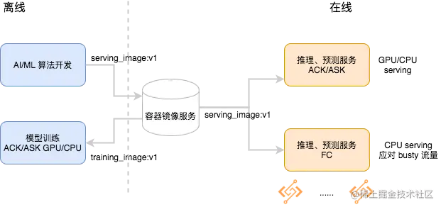 AI/ML 推理预测服务同样可以享受 FaaS 免运维、自动伸缩、低成本的好处。然而社区流行的框架如 TensorFlow 都默认以容器镜像的方式分享和复用。不仅官方提供了完整的版本覆盖,基于官方镜像的社区生态也非常活跃。在离线模型训练阶段以容器镜像部署在 ECS 或 ACK/ASK GPU 集群。 在服务推理/预测(serving inference/prediction)阶段,CPU 往往是性价比更高的选择。Serving 的特点是请求量驱动,既需要能快速响应突发(burst)流量,又要在波谷周期释放资源,甚至是缩容至0节省成本。而这些需求天然就是函数计算所擅长的。