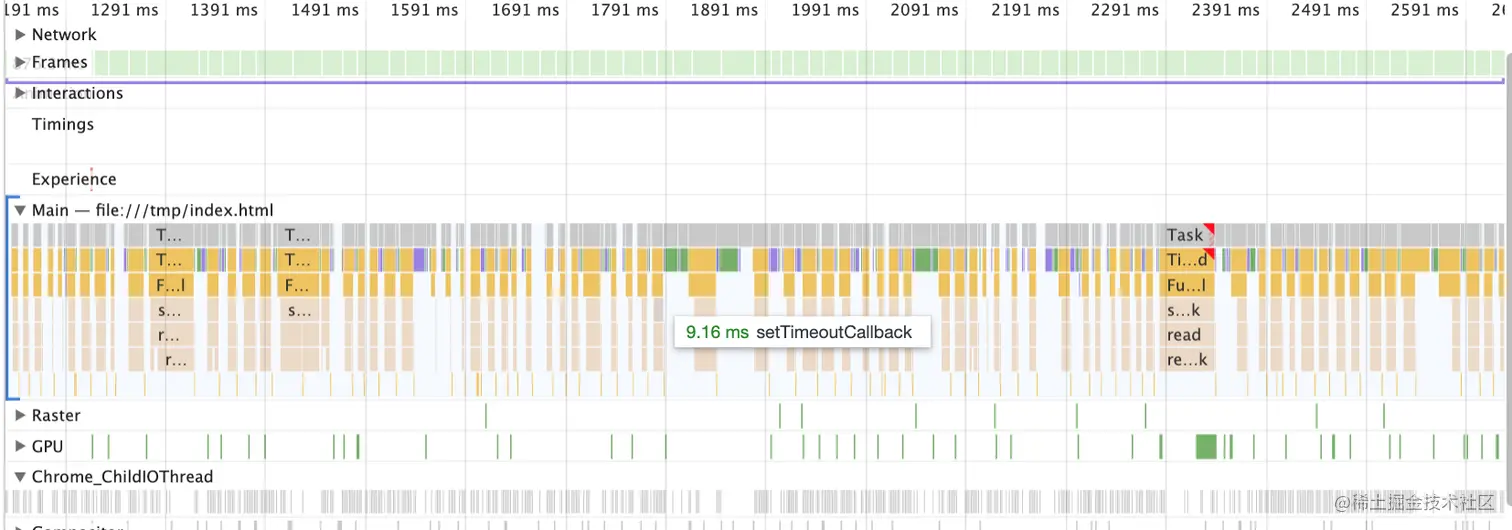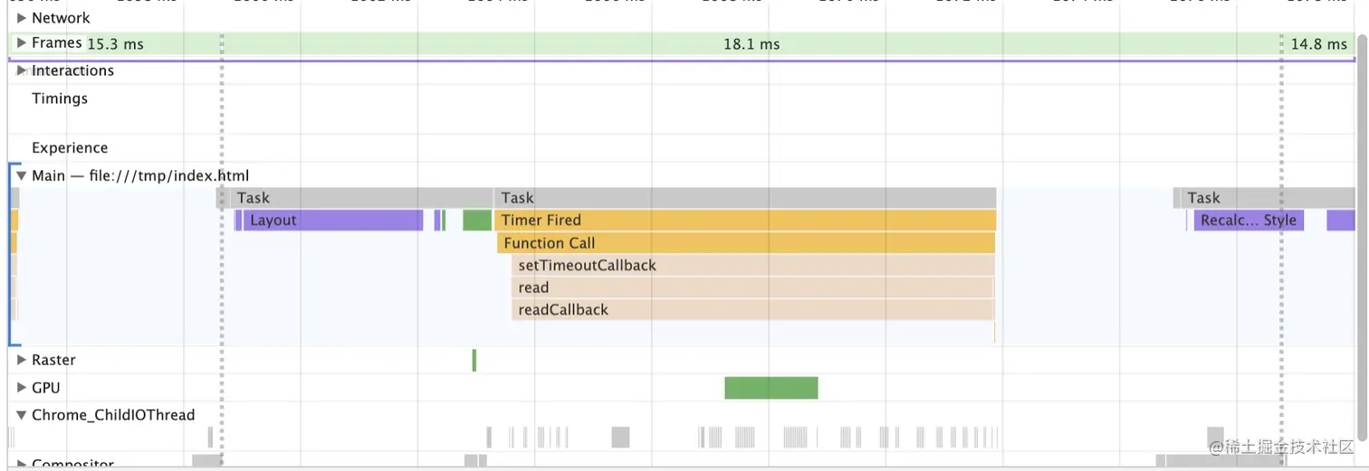 通过 Chrome Performance 的图片来验证上面的观点,黄色的 js 任务被拆分,于紫色的 Layout 和绿色 Print 交错执行。