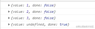 从图上可以看出,当我们执行第一次 done 属性返回 false ,这里的代表如果还有 next() 可以继续往下执行,返回 true 表示之后就没有节点了,返回 undefined 。