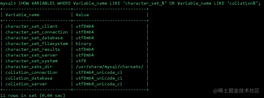SHOW VARIABLES WHERE Variable_name LIKE 'character_set_%' OR Variable_name LIKE 'collation%';