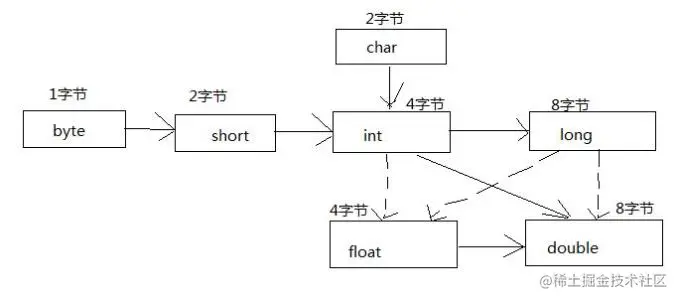 - 自动类型转换(隐式):小类型 -> 大类型。eg: