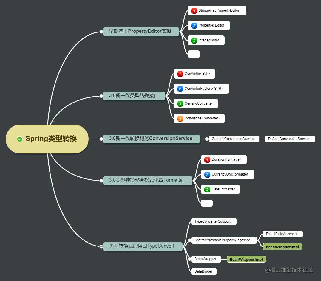 Spring的类型转换也并非一步到位。完全掌握Spring的类型转换并非易事,需要有一定的脉络按步骤进行。本文作为类型转换系列第一篇文章,将绘制目录大纲,将从以下几个方面逐步展开讨论。