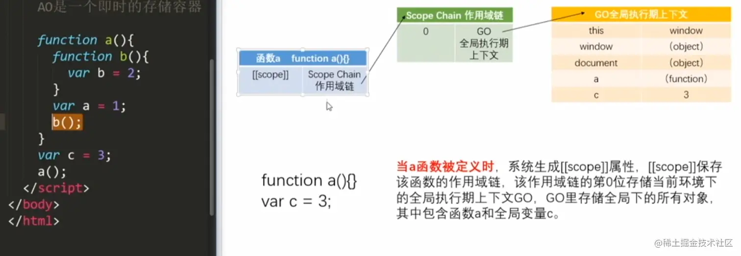 c 定义: c.[[scope]] -> 第0位 0 : b ->AO; 1 : a-->AO; 2:GO