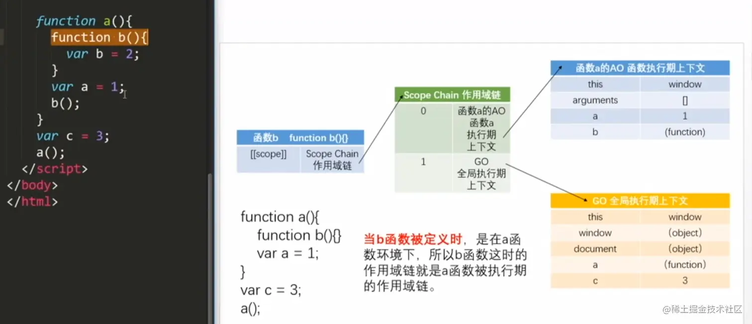 b 执行: b.[[scope]] ->第0位 0 : b ->AO; 1 : a ->AO 2: GO