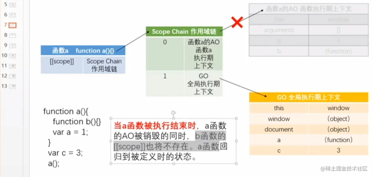 b 结束: b.[[scope]] -> 第0位 0 : a ->AO; 1 : GO 同时c.[[scope]] 没有了