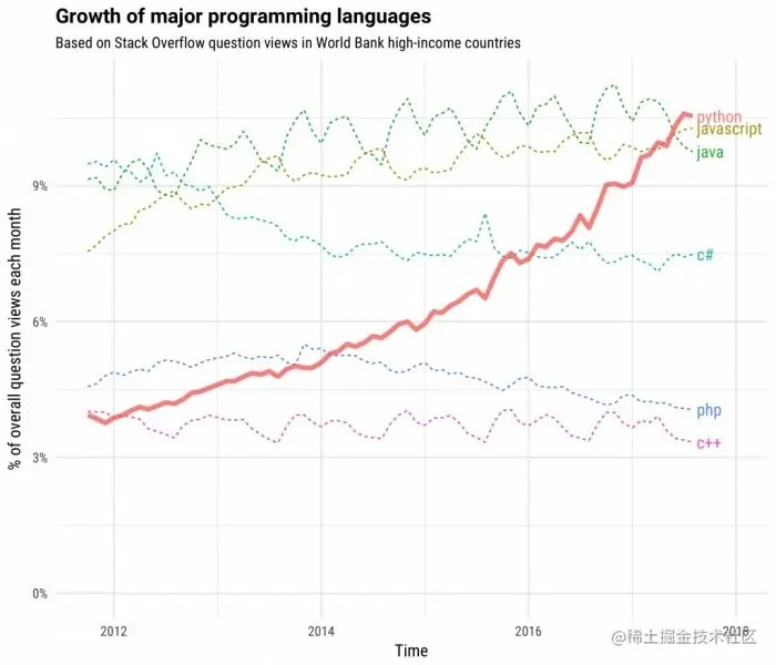 Python的确挺神的~但不是生来就那么神。Python是在1991年被创造出来的,但真正开始被广泛使用是Python 2.6以后的事情了。从2012年开始到现在,Python的热度持续累积,成为关注度增长最快的语言。