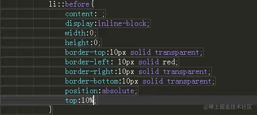 如何在li前面创造三角形元素 杨璐泽 2020-12-08 435 阅读1分钟 li前默认样式是一个黑色实心原点,那么怎么把它更换呢,下面给大家看下过程 先创造ul跟li 去掉li前的小点 创造伪类元素。 把伪类元素样式改为三角形。 还可以通过定位改变位置 到这里那么一个li前面的三角形我们就做出来啦 感谢各位观看
