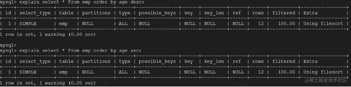 从上面的例子可以看出,第一个SQL语句需要进行"filesort",而 第二个SQL由于order by null 不需要进行 "filesort", 而上 文提过Filesort往往非常耗费时间。