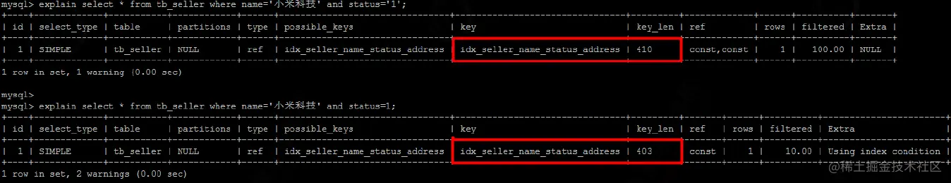 根据前面的两个字段name,status查询是走索引的,但是最后一 个条件address 没有用到索引。