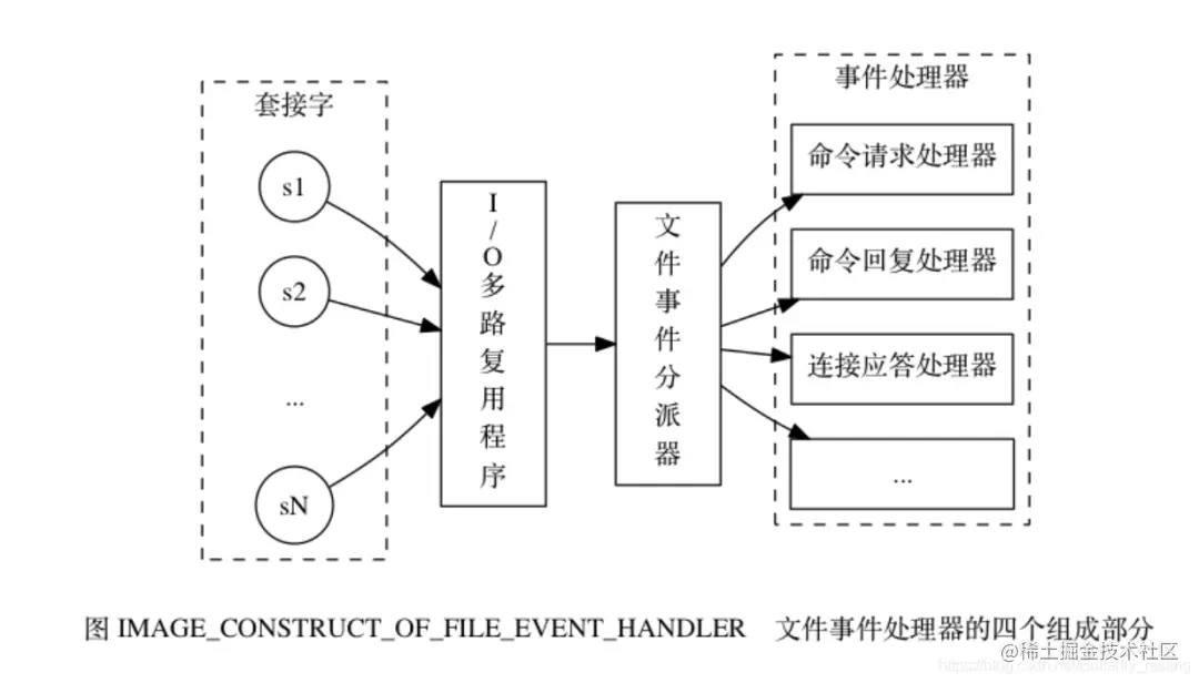 文件事件处理器包括分别是套接字、 I/O 多路复用程序、 文件事件分派器(dispatcher)、 以及事件处理器。使用 I/O 多路复用程序来同时监听多个套接字, 并根据套接字目前执行的任务来为套接字关联不同的事件处理器。