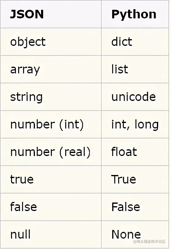 json 类型转换到 python 的类型对照表: