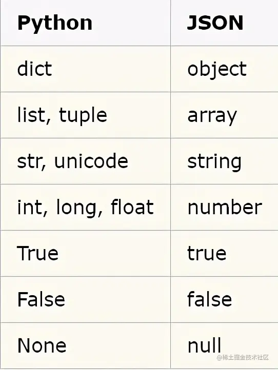 python 原始类型向 json 类型的转化对照表: