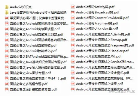它们都是我平时也经常翻看、学习的一些珍藏资料,包括Java基础、Android进阶、架构设计、NDK、音视频开发、跨平台、底层源码等技术,还有往年一线大厂最新面试题集锦,都分享给大家,助大家学习路上披荆斩棘~ 能力得到提升,思维得到开阔~
