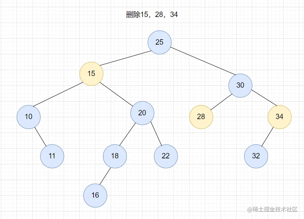 二叉查找树的查找和插入的操作比较简单,但是删除的操作较为复杂,分为三种情况。 第一种情况,要删除的节点是叶子节点。此时只需要直接将父节点中指向要删除节点的指针置为null即可。如下图中删除28。 第二种情况,要删除的节点有只有一个子节点(左子节点或右子节点),我们只需要更新父节点中的指针,让它指向要删除节点的字节点就可以了。如下图中的34。 第三种情况,要删除的节点有两个子节点。这种情况下,我们需要把要删除节点的右子树中最小的节点替换要删除节点。如下图中的15。