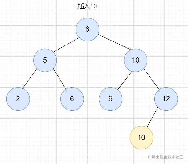 前面对二叉查找树的操作,针对的都是不存在重复数据的情况。如果需要存储重复数据,在插入数据时,如果碰到一个节点的值和要插入的值相等,我们把这个要插入的数据放在这个节点的右子树。也就是说,把这个新插入的数据当作大于这个节点的值来处理。
