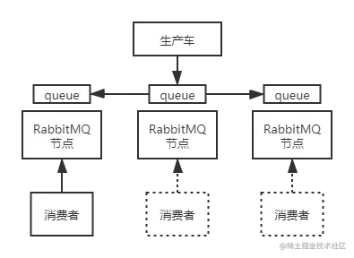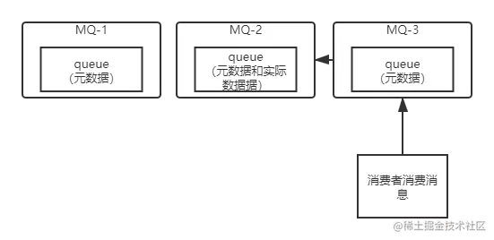 假如rabbitmq集群有三台机器,此时向集群中的MQ-2机器写入一条消息,则MQ-1和MQ-3只会同步这个queue的元数据,即这条消息存在哪个机器上等一些配置信息,并不会同步实际数据。当消费者在MQ-3上请求消费这条消息时,MQ-3会根据元数据的信息向MQ-2请求这条queue的实际数据并将它返回给消费者。