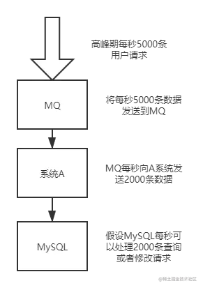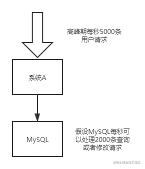 不使用MQ时高峰期系统崩溃的场景:每天的12点左右,用户对系统A请求为每秒5000条,但是MySQL数据库每秒仅能处理2000条数据,此时系统崩溃。