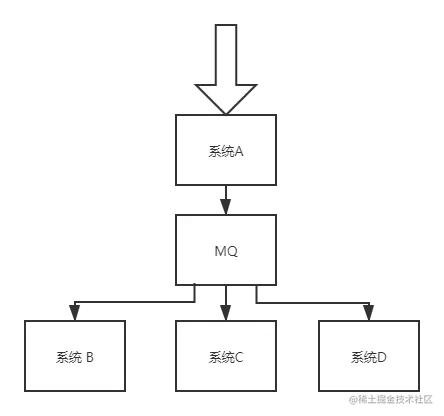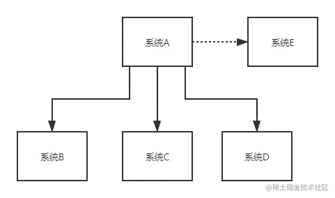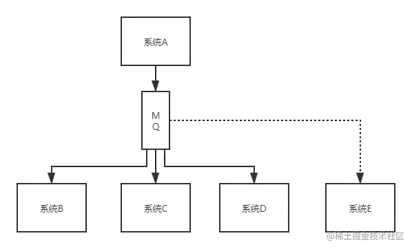 不用MQ的耦合场景:假设有系统A发送数据到B,C,D三个系统,此时增加系统E,则系统A需要修改对应代码。若是B系统弃用。则也需要修改A系统代码。