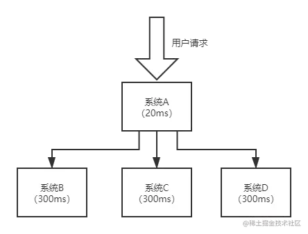 不使用MQ的同步高延时场景:用户对系统A发起请求,并且系统A调用系统B、C、D三个系统,总耗时将近1秒。并且B、C、D三个系统的处理结果并不及时同步返回给用户。这样用户使用系统A发送请求需要近一秒才有返回,体验极差。