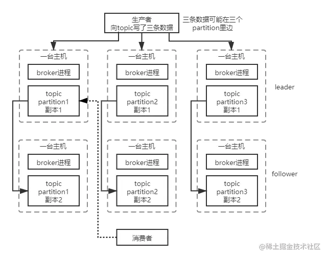 任何一个节点宕机,其他节点上还包含了完整的数据,消费者可以读取并消费数据。