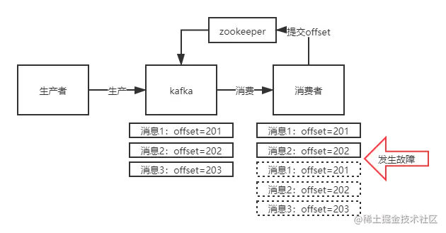 若是在消息2消费完之后,但是并没有到提交offset的时间,此时发生故障,断开连接亦或消费端重启。恢复正常之后,消费者向kafka请求继续消费数据,此时kafka查看zookeeper为消息1,2,3消费之前。此时kafka将会把消息1,2,3再次发送给消费者。导致消息1,2被重复消费。