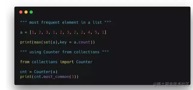 给定一个包含多个元素的list,让你查找其中出现次数最多的元素,你会怎么做?在下图中,我们介绍了两种方法,其中第一种是利用max()函数的key参数,第二种则是使用Counter。