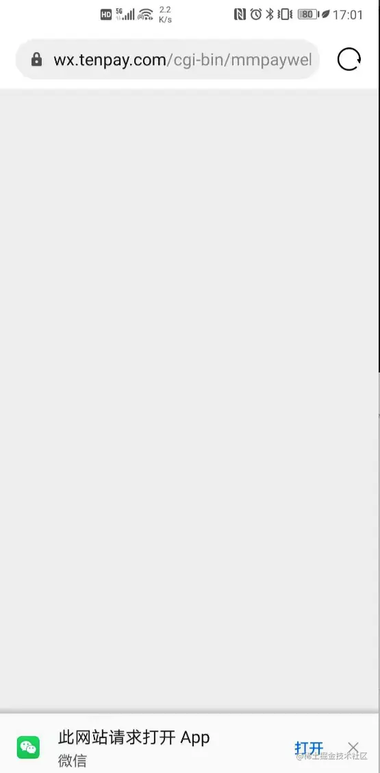 在接口返回的字段里如果后端没有处理则需要自己处理返回的字符串,如上图使用正则提取出 mweb_url,在 mweb_url 末端需要加上支付完成后跳转的页面链接(需要使用 encodeURI 处理),在支付完成之后跳回到原来的页面(这里的 OpenWebView 方法需要你们原生开发提供新开一个 webview,或者直接通过 js 创建一个跳转,这个根据不同场景使用)。