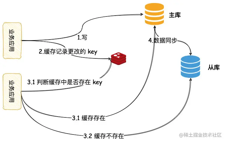 - 写请求发往主库,同时缓存记录操作的 key,缓存的失效时间设置为主从的延时