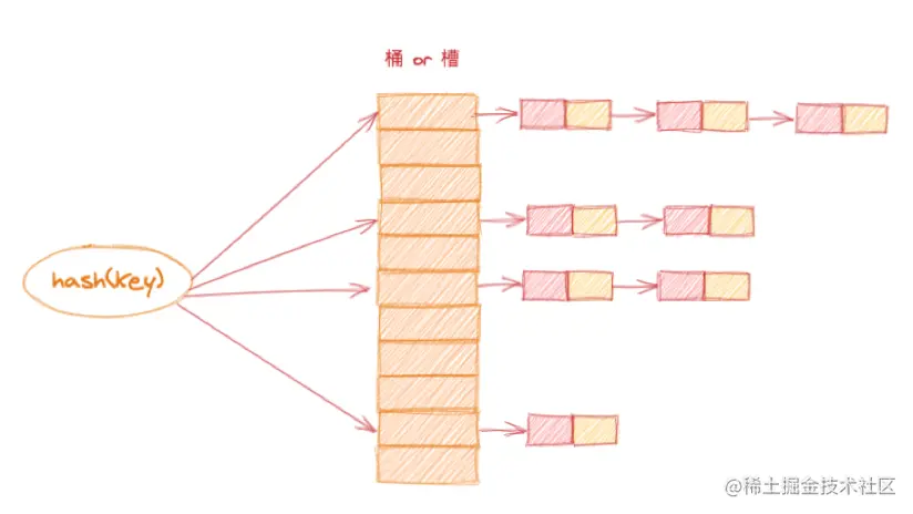 链表法是一种更加常用的散列冲突解决办法,相比开放寻址法,它比较简单。在散列表中,每个“桶(bucket)”或者“槽(slot)”会对应一条链表,所有散列值相同的元素都放到相同槽位对应的链表中