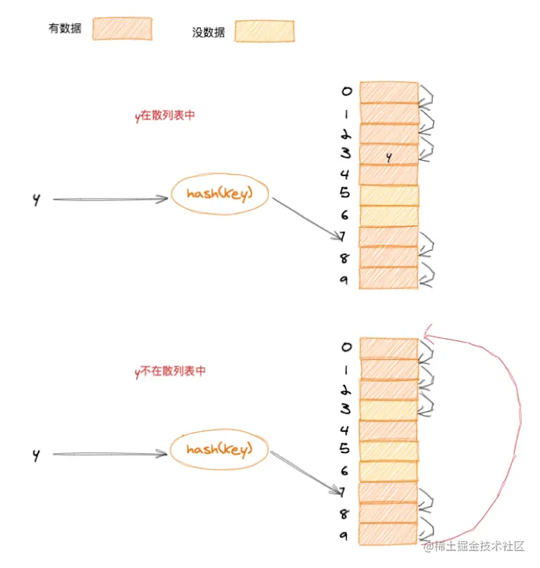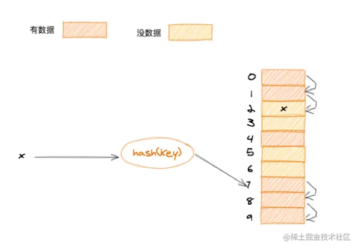 从图中可以看出,散列表的大小为10,在元素x插入散列表之前,已经有6个元素插入到散列表中。x经过hash算法之后,被散列到下标为7的位置,但是这个位置已经有数据了,所以就产生了冲突。于是就顺序地往后一个一个找,看有没有空闲的位置,遍历到尾部都没有找到空闲的位置,于是再从表头开始找,直到找到空闲位置2,于是将其插入到这个位置