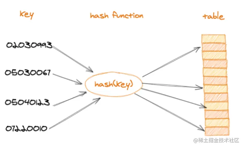 上边的的例子,散列函数比较简单,也比较容易想到。但是,如果学生的编号是随机生成的6位数字,又或者用的是a到z之间的字符串,这种情况,散列函数就会复杂一些