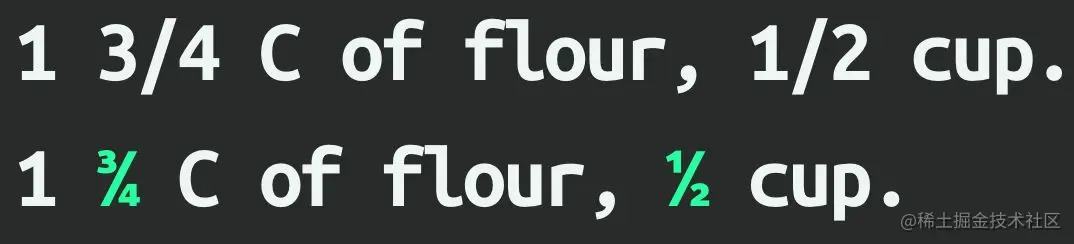 diagonal-fractions斜角分数字(OpenType 特性frac)。 -