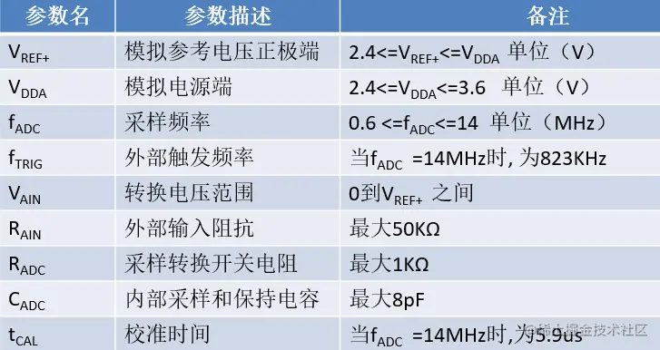ADC 输入电压范围为: VREF- ≤ VIN ≤ VREF+。由 VREF-、 VREF+ 、VDDA 、 VSSA 这四个外部引脚决定,其电气特性如下表,所以,ADC供电要求:2.4V到3.6V。一般把 VSSA 和 VREF-接地,把 VREF+和 VDDA 接 3.3V,因此 ADC 的输入电压范围为:0-3.3V。我们使用的开发板 ADC输入电压范围为 0-3.3V。