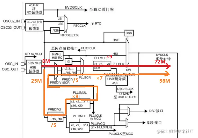 选择上图的橙色路线,来配置系统时钟,获取ADCCLK时钟。HSE(25MHz)作为系统时钟来源,经过PLL2的5分频,8倍频,获得PLL2_CLK=(HSE / 5) * 8 = 40 MHz,再经过PLL的5分频,7倍频,获得PLL_CLK = (PLL2_CLK/ 5) * 7 = 56 MHz,即得系统56MHz时钟,即PCLK2(APB2时钟)为56MHz,PCLK2进行4分频得到 ADC_CLK = 14 MHz。
