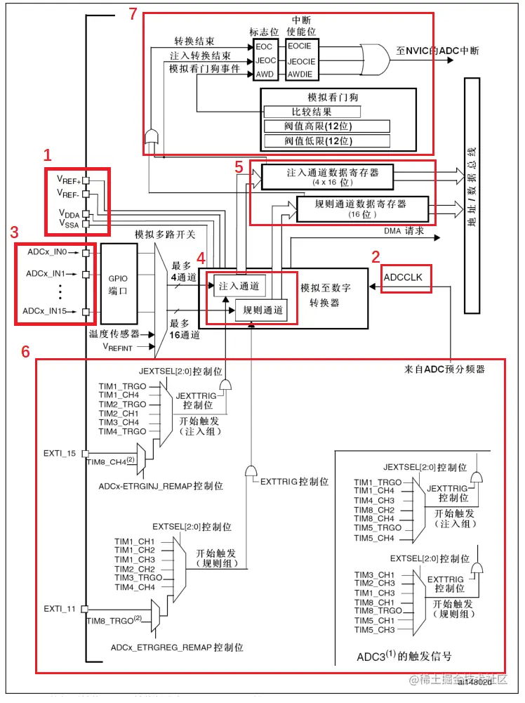 ADC的结构框图如下,把 ADC 结构框图分成 7 个子模块,按照顺序依次进行简单介绍。