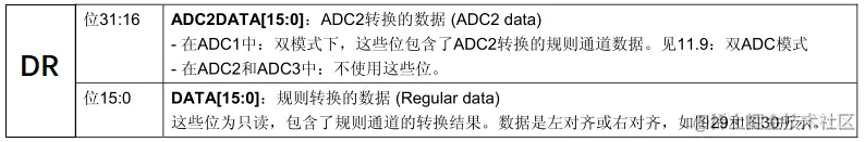 规则数据寄存器负责存放规则通道转换的数据,通过32位寄存器ADC_DR来存放。