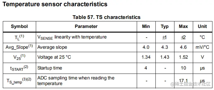 温度(°C) = {(V25 - VSENSE) / Avg_Slope} + 25