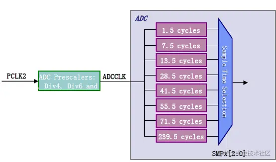 ADC 的总转换时间跟 ADC 的输入时钟和采样时间有关,其公式如下: