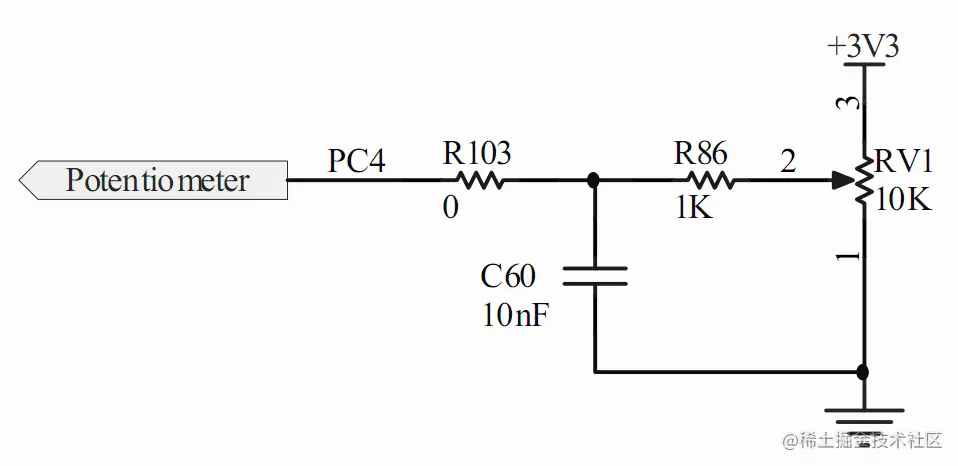 由上图可以知道,PC4连接在一个电阻调节器上,而PC4是作为ADC的一个采集通道的,所以模拟信号是从此处得到的,然后通过PC4这个通道传入。