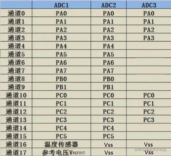 STM32 的 ADC 的输入通道多达 18 个,可测16个外部和2个内部信号源,其中外部的 16 个通道就是框图中的 ADCx_IN0、ADCx_IN1、...、ADCx_IN15(x=1/2/3,表示 ADC 数),通过这 16 个外部通道可以采集模拟信号。这 16 个通道对应着不同的 IO 口,如下图。其中 ADC1 还有 2 个内部通道:ADC1 的通道 16 连接到了芯片内部的温度传感器,通道 17 连接到了内部参考电压 VREFINT。ADC2 和ADC3 的通道 16、 17 全部连接到了内部的 VSS。