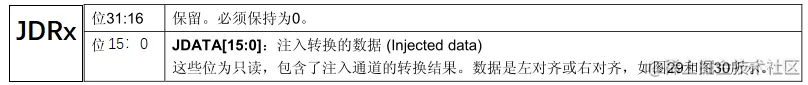 注入通道转换的数据寄存器有4个,由于注入通道最多有4个,所以注入通道转换的数据都有固定的存放位置,不会跟规则寄存器那样产生数据覆盖的问题。ADC_JDRx 是 32 位的,低 16 位有效,高 16 位保留,数据同样分为左对齐和右对齐,具体是以哪一种方式存放,由ADC_CR2 的 11 位 ALIGN 设置。