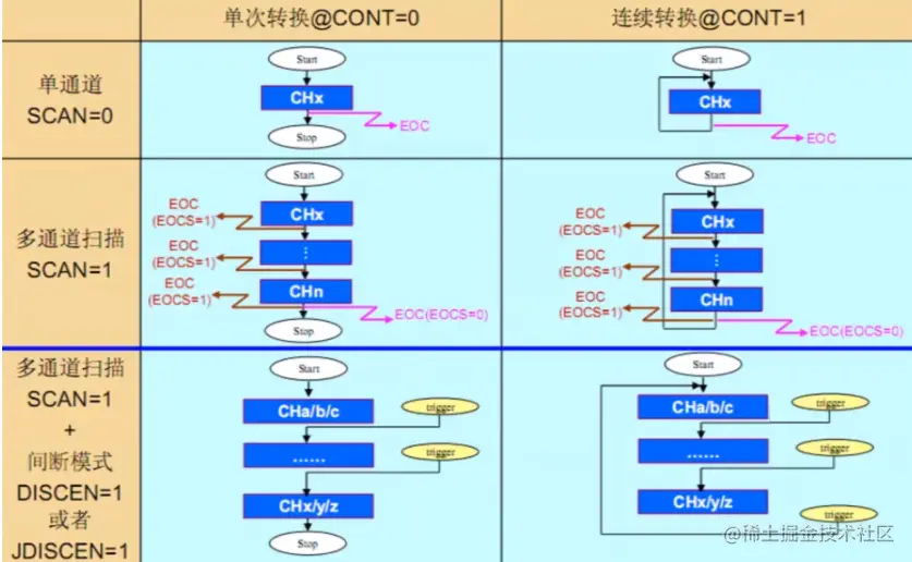 STM32的ADC的各通道的转换模式有:单次转换模式、连续转换模式、扫描模式、中断模式。
