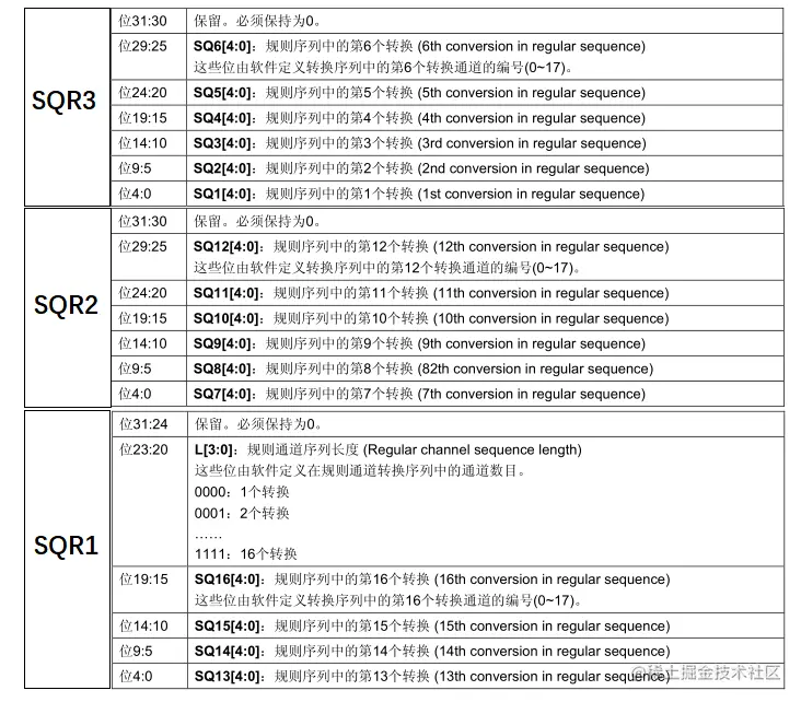 规则通道组序列寄存器有 3 个,分别是 SQR3、 SQR2、 SQR1,它们控制了规则通道中的转换顺序,如下图所示。只要在对应的寄存器位SQx中写入相应的通道,这个通道就是第x个转换。例如通道 3 想第一次转换,那么在 SQ1[4:0]写 3即可。具体使用多少个通道,由 SQR1 的位 L[3:0]决定,最多 16 个通道。