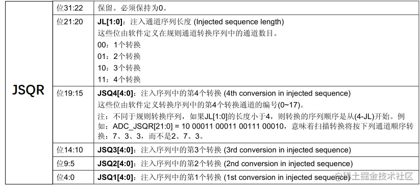 注入通道组序列寄存器只有一个,是 JSQR。它最多支持 4 个通道,具体多少个由 JSQR 的 JL[1:0]决定。注意: