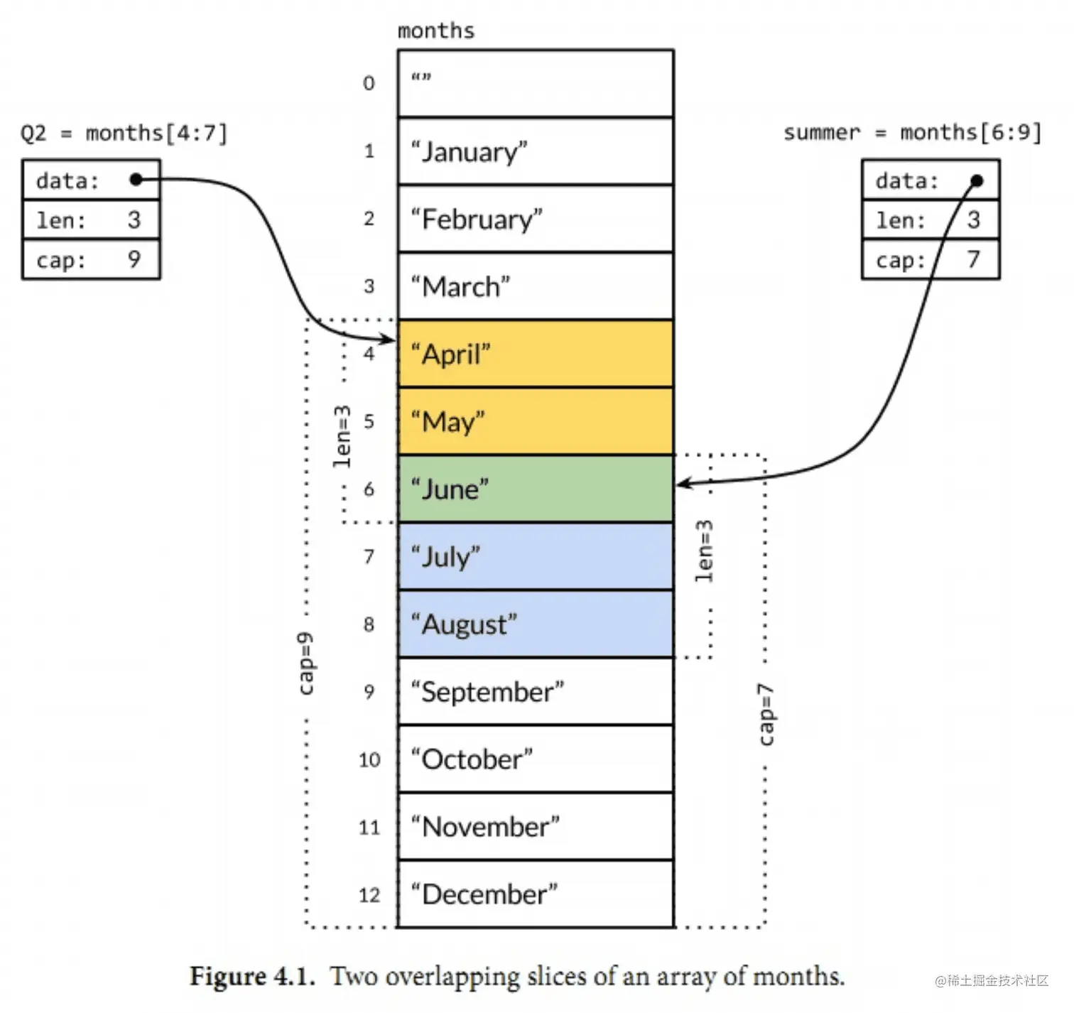 如图所示,slice的结构,指针、长度(len)、容量(cap)。