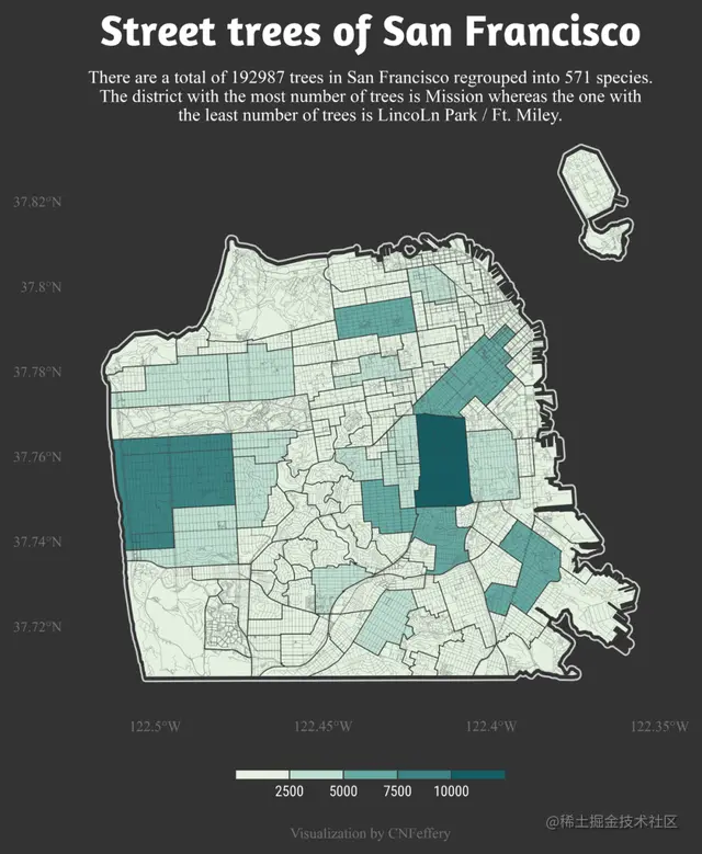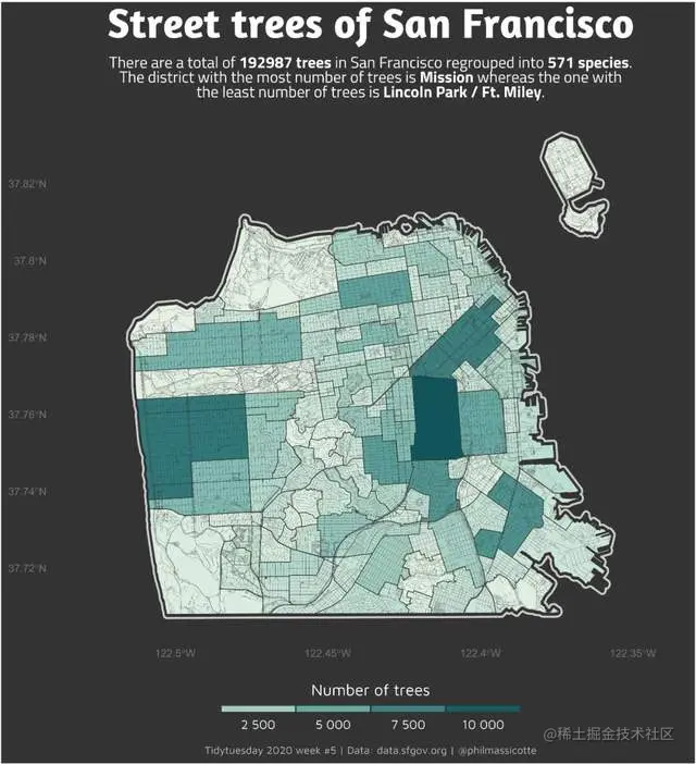 开门见山,今天我们要模仿的数据可视化作品来自 「#TidyTuesday」 活动于2020年1月28日发布的**「旧金山街道树木数据集」**下的众多参赛作品中,由Philippe Massicotte创作的(如图1所示)非常受欢迎的 「Street trees of San Francisco」: