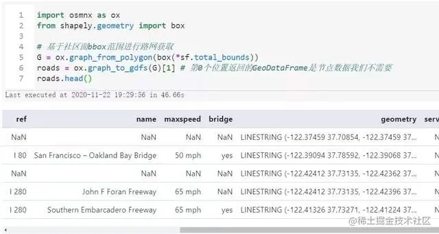 而路网数据我们则可以利用osmnx进行在线获取,只需传入我们的旧金山面数据bbox范围,配合