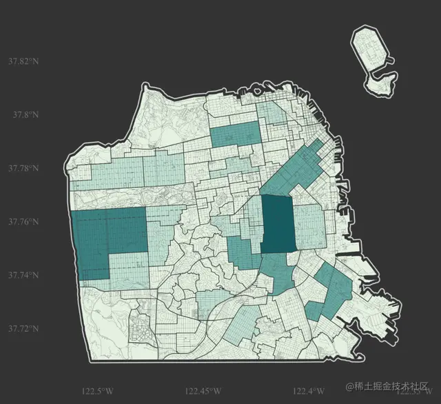 我们仔细观察原作品,可以get到其主要视觉元素是将统计出的数值映射到每个社区面色彩之上,且外围的轮廓描边,很明显是整个地区对应整体的向外缓冲区,再辅以道路网,使得整张图看起来显得很“精密”。
